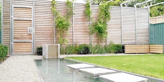 Auch kleine Gärten können bei entsprechender Planung voll zur Geltung kommen. Dies ist ein Beispiel für eine Gestaltung mit linearen, rechtwinkeligen Formen. Stahl, Holz, Beton, Kies und Wasser – die eingesetzten Materialien und Elemente unterstreichen den Stil.